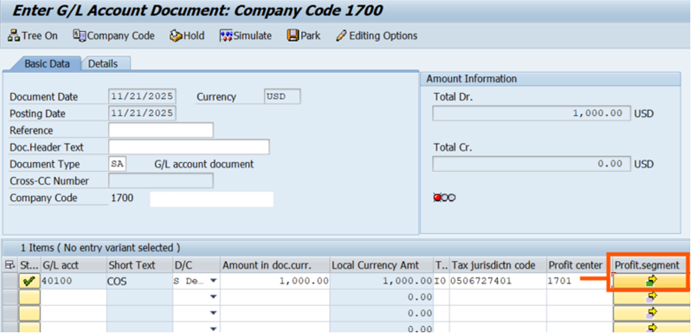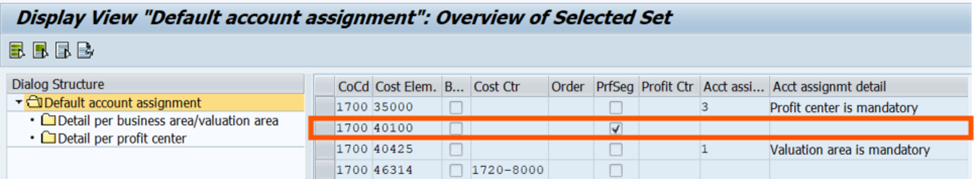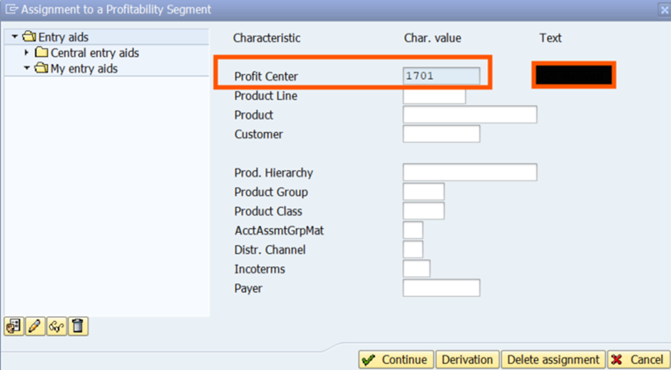 PrfSeg aims to derive the profitability segment for the line item based on available information in the line item. What do I mean by available information here? Consider the following figure. In this example, the profitability segment was derived automatically based on the profit center entered. You can view these types of postings in the KE24 report for costing-based profitability analysis.