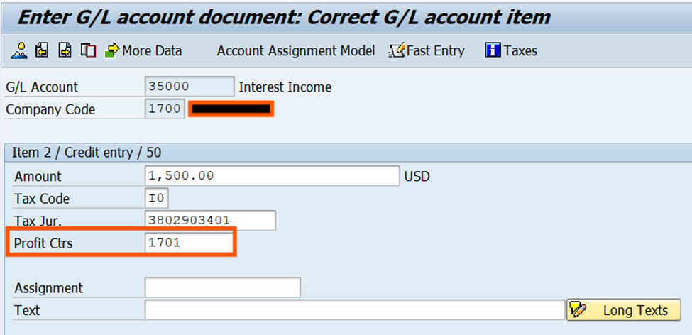 In the figure above, the G/L account is set to receive cost center 1720-8000 during the posting. Hence, when you choose G/L account 46314 to post under company code 1700, the cost center 1720-8000 will be derived automatically, as shown in this figure.