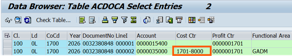 As shown above, only the profit center is entered while the cost center field is suppressed through the field status group. This prevents users from accidentally selecting an incorrect cost center during entry. However, the transaction can still be reported against the appropriate cost center, as confirmed by the ACDOCA table entry of the posted document shown below. You can also view these entries in table BSEG.