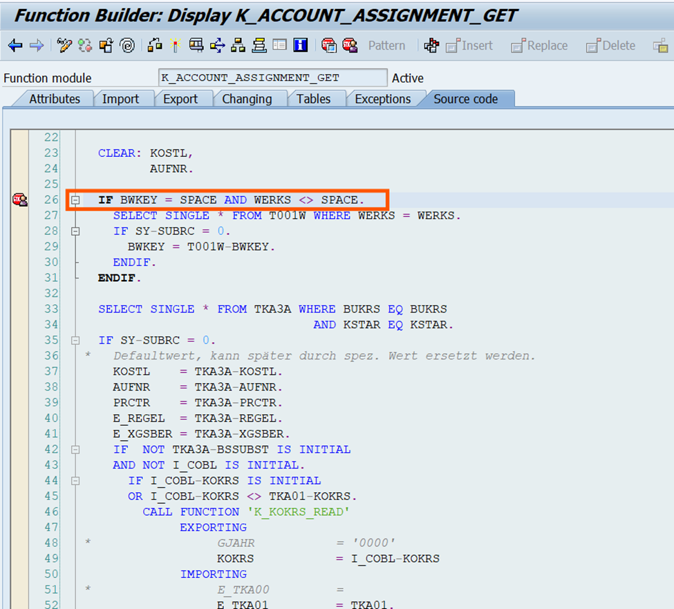 During document posting, SAP executes the OKB9 default account assignment logic at runtime via function module K_ACCOUNT_ASSIGNMENT_GET. Setting a breakpoint in this function module allows consultants to trace how the system evaluates OKB9 configuration and to understand why a CO account assignment was derived (or not derived) for a specific posting.